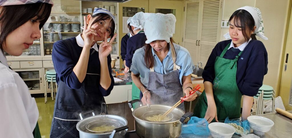 自分たちで作った麺をゆでて、